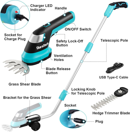 DURATECH Cordless Hedge Trimmer, 7.2V 3-in-1 Handheld Electric Grass Trimmer & Hedge Shears with 50" Wheeled Extension Pole, USB Type-C Cable and Built-in Li-ion Battery, for Garden, Yard and Lawn