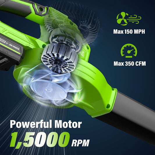 SEYVUM Cordless Leaf Blower, 20V Blower with 2 X 2.0 Ah Battery, Electric Blower for Lawn Care, 350 CFM 150 MPH Battery Powered Leaf Blower with Charger, for Patio, Garden Cleaning, Green