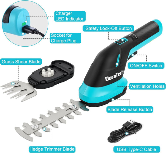 DURATECH Cordless Hedge Trimmer, 3.6V 2-in-1 Handheld Rechargeable Grass Trimmer & Hedge Shears with USB Type-C Cable, Built-in Li-ion Battery, Electric Shrub & Grass Shears for Garden, Yard and Lawn