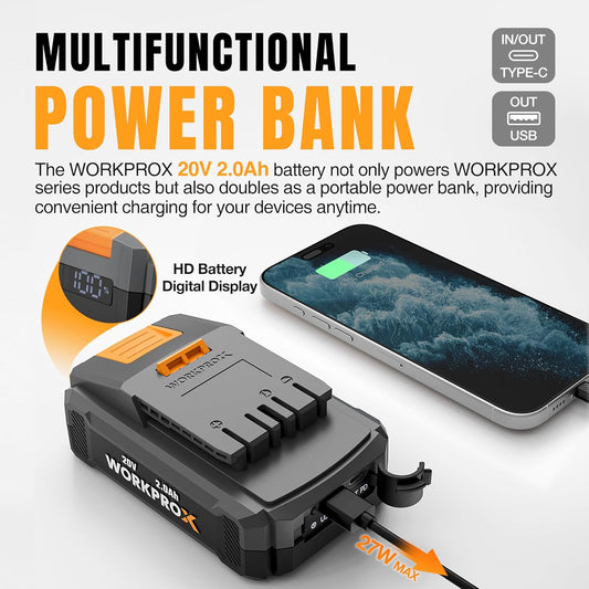 WORKPROX 20V Cordless Grass Shear & Shrubbery Trimmer - 2-in-1 Handheld Electric Grass Trimmer Hedge Shears/Grass Cutter, Rechargeable Lithium-Ion Battery and Type-C Cable Included