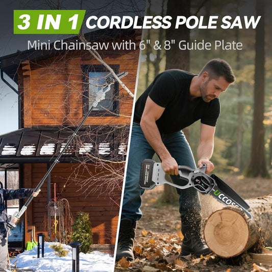 3-in-1 Electric Pole Saws for Tree Trimming 6&8" Mini Chainsaw Cordless with Extension Pole, 850W Brushless Motor,Auto Oiling,Total Reach of Max 15ft, Pole Saw for Home & Garden & DIY