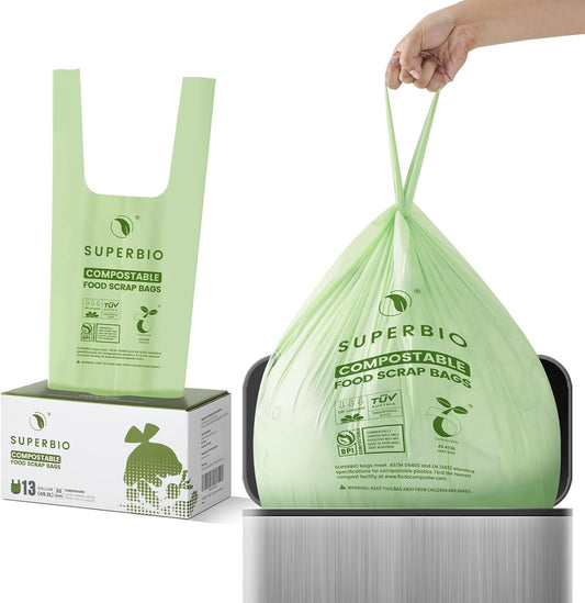 SUPERBIO 13 Gallon Compostable Kitchen Waste Bags with Handles, Food Scrap Bags Certified by BPI, OK compost INDUSTRIAL, 30 Count, 49.2L