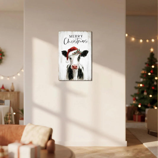 Christmas Cow Canvas Wall Art – Framed Farmhouse Decor for Xmas, Ready to Hang Print Holiday Gifts for Bedroom & Living Room Indoor 10x15 Inch
