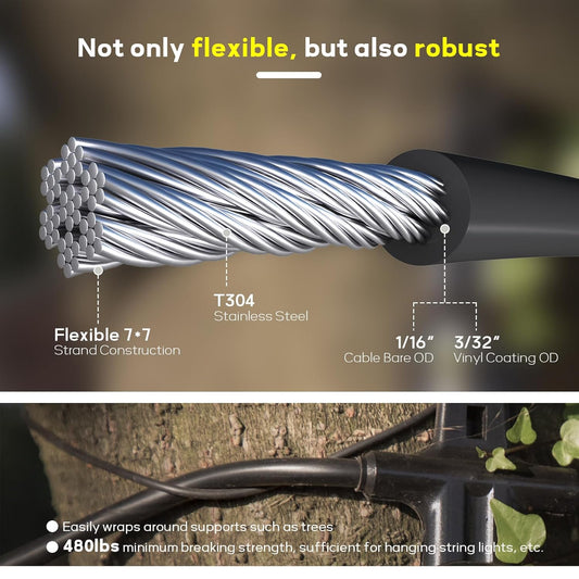 1/8" Wire Cable Rope Kit ,Vinyl Coated 304 Stainless Steel Wire – 100FT 7x7 Strand Cable with Turnbuckles,String Lights Hanging Kit for Outdoor, Garden,Patio, Crafts, Hanging Lights
