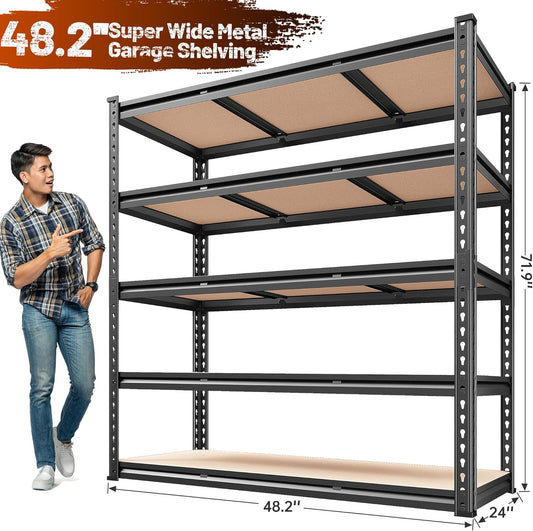 REIBII 48.2" W Garage Shelving, Storage Shelves Load 3000LBS, Adjustable Garage Shelving Heavy Duty for Pantry, Basement, Warehouse, 48.2" W X 71.9" H X 24" D, Black