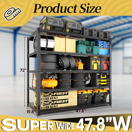 47.8" W Heavy Duty Garage Shelving 3000LBS Storage Shelves, Adjustable 5-Tier Storage Rack, Metal Shelves for Garage/Warehouse/Basement, 47.8" W x 19.8" D x 72" H, Black