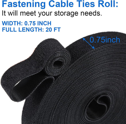 OneLeaf Fastening Cable Management Roll, 20ft x 3/4inch Cut to Length Straps, Reusable Multi-Purpose Cords Management, Double Sided Hook and Loop Cable Ties Roll (Black)