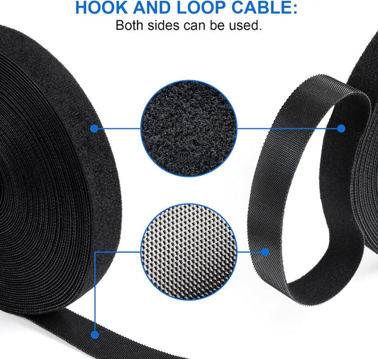 OneLeaf 20ft x 1/2inch Fastening Cable Ties Roll, Reusable Self-Gripping Strips, Double Sided Hook and Loop Tape Cable Management, Cut to Length Straps, Black Heavy Duty Wire Management