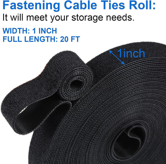 OneLeaf Hook and Loop Roll Reusable Fastening Cable Ties, 20ft x 1inch Black Heavy Duty Cord Organizer Straps, Free Cutting Multi-Purpose Cable Management Tape for Home and Office