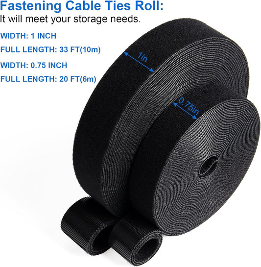 OneLeaf Hook and Loop Roll Reusable Fastening Cable Ties, 33ft x 1inch Black Heavy Duty Cord Organizer Straps, Free Cutting Multi-Purpose Cable Management Tape for Home and Office