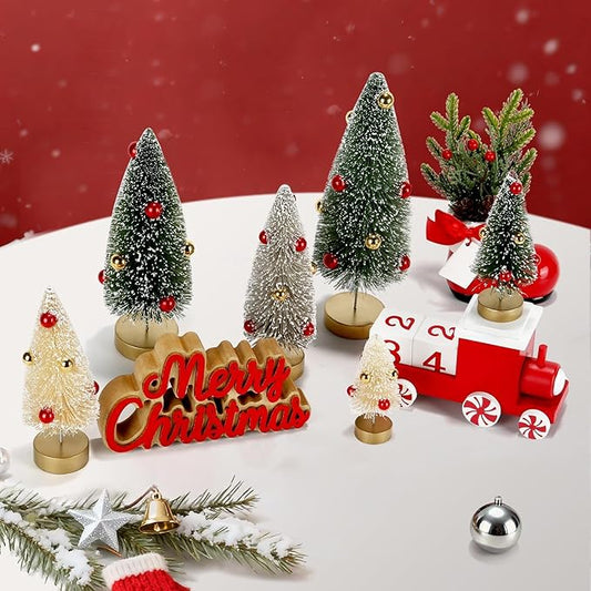 6 Pack Mini Christmas Trees, Small Miniature Frosted Bottle Brush Christmas Tree Decorations Tiny Tabletop Villiage Sisal Trees Decorated with Snow and Beads Winter Holiday Décor Assorted Sizes