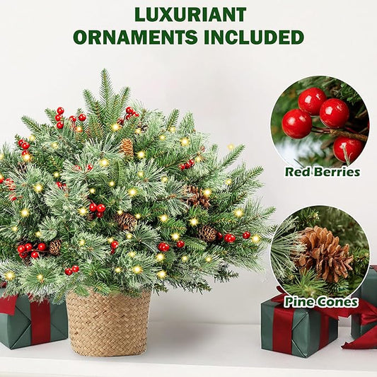18 Inch Pre-lit Outdoor Christmas Tree, Frosted Christmas Urn Filler for Pathway &Porch& Yard Decorations, with 50 LED 8 Modes Lights,Battery Powered, Decor with Cones & Red Berries