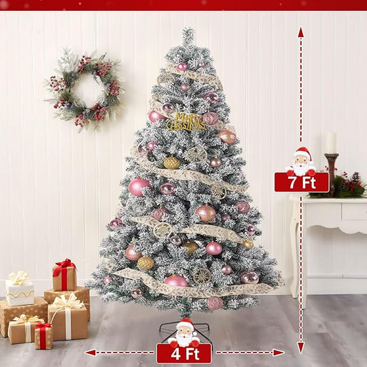 7FT Green Artificial Christmas Tree with 1200 Realistic Branch, Flocked Full Xmas Tree with Foldable Stand, Easy Assembly Hinged Pine Tree for Home, Shop, Office, Party Holiday Decoration