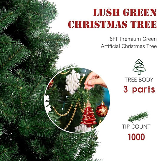 6FT Premium Christmas Tree, Large Spruce Artificial Holiday Xmas Tree with 1,000 PVC Branch Tips for Home, Office, Party Decoration, Metal Hinges & Foldable Base, Easy Assembly,Green