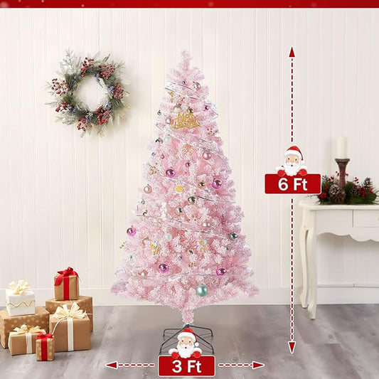 6ft Prelit Pink Artificial Christmas Tree with 150 Warm White LED Lights, Full Snow Flocked Xmas Tree Featuring 1000 Realistic Branch, Easy Hinged Assembly for Home Office Party Decoration