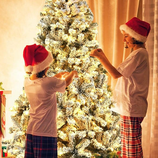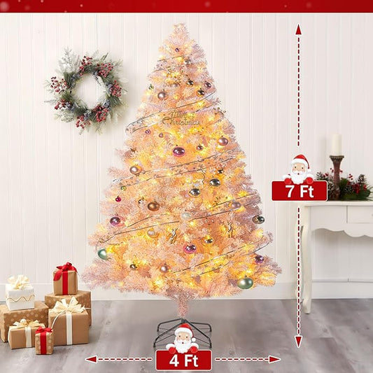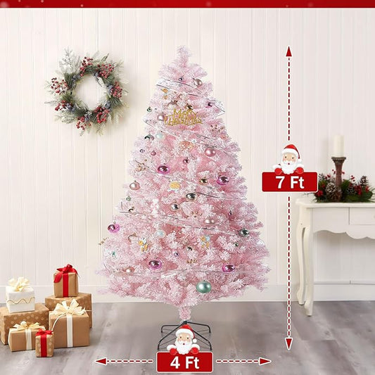 7ft Prelit Pink Artificial Christmas Tree with 250 Warm White LED Lights, Full Snow Flocked Xmas Tree Featuring 1200 Realistic Branch, Easy Hinged Assembly for Home Office Party Decoration