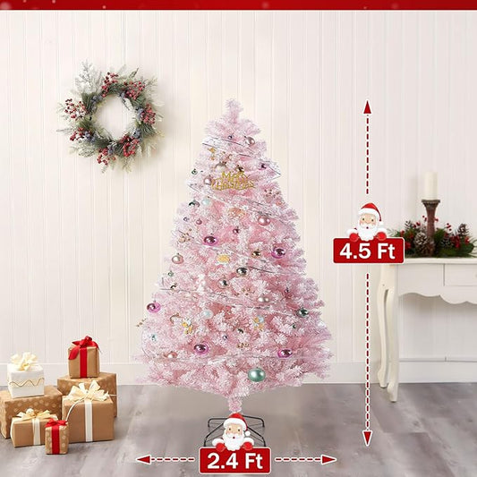 4.5FT Pink Artificial Christmas Tree with 400 Realistic Branch, Flocked Full Xmas Tree with Foldable Stand, Easy Assembly Hinged Pine Tree for Home, Shop, Office, Party Holiday Decoration