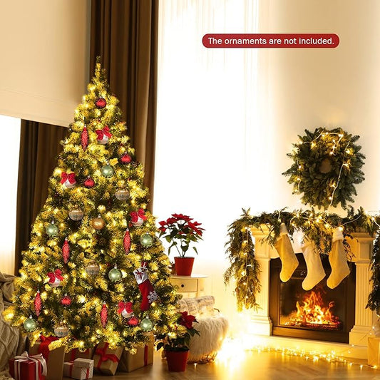 Happygrill 6ft Pre-lit Snowy Christmas Tree Pre-Strung Xmas Decoration Tree with 250 Warm White LED Lights & 818 PVC Tips, 8 Lighting Modes, Hinged Artificial Tree for Residential Commercial Use