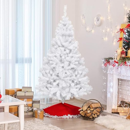 HAPPYGRILL 6 Feet White Artificial Christmas Tree with 1000 PVC Branch Tips Unlit Hinged Xmas Pine Tree with Sturdy Metal Base, Artificial Pine Tree for Indoor Outdoor Decor