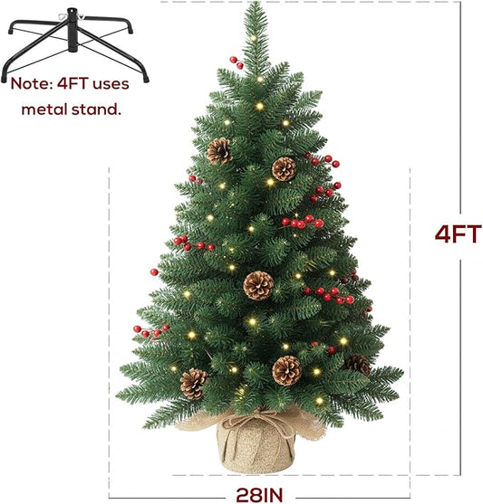 4ft Prelit Artificial Small Christmas Tree with Warm White Multi-Color LED Lights, Remote Control and Timer Operated, Metal Stand Red Berries & Pine Cone Slim Pencil Decoration for Indoor/Outdoor