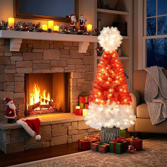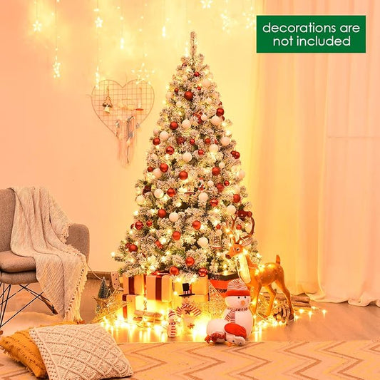 6ft Flocked Christmas Tree Prelit, Slim Artificial Christmas Tree with 300 Warm White & Multicolor Twinkle Lights,1582 PE & PVC Mixed Branch Tips for Home Office Store, Holiday Decoration