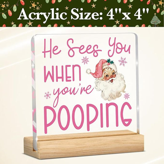 Christmas Bathroom Decor, Funny Pink Christmas Decorations, Santa Claus Acrylic Bathroom Table Decoration He Sees You When You're Pooping Sign, Home Shelf Desk Decor for Toilet 4x4 Inches