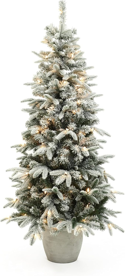 LuxenHome 5FT Small Potted Christmas Tree, Prelit Flocked Christmas Tree with Pot, Artificial Xmas Trees with 100 LED Lights, Lighted Pine Trees for Indoor, Outdoor Holiday Display