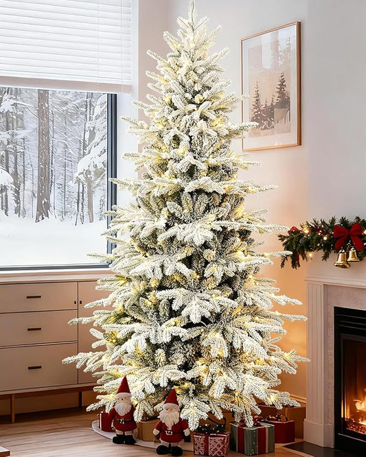 Prelit Christmas Tree 7ft, Artificial Flocked Christmas Tree with 400 Warm White & Multicolor Lights, 2086 PE PVC Tips, LED Frosted Xmas Tree with Snow, 9 Color Modes, Hinges, Home Decor