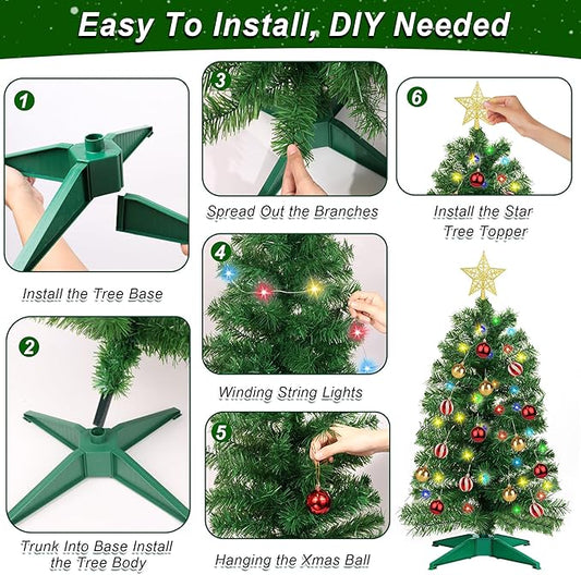 3FT Green Christmas Tree Tinsel with 50 Warm White & Multi Color Fariy Light 3D Star 15 Ball Ornament, 12 Light Modes Timer Battery Operated Small Artificial Full Xmas Tree Table Indoor Holiday Decor