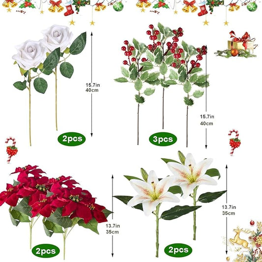HUAESIN Poinsettias Artificial Christmas Flowers Cemetery Silk Christmas Floral Arrangements with Lily Rose Red Holly Berries Winter Flowers Christmas Picks for Xmas Home Vase Table Grave