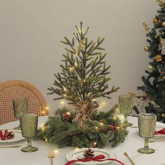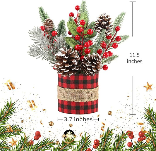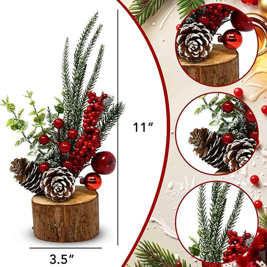 GIft Boutique Christmas Mini Tabletop Tree with Small Artificial Decorative Pine Cone Berries Ornaments Wood Base Home Room Indoor Outdoor Party Decor