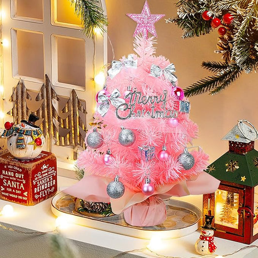 Small Mini Christmas Tree Pink with 50 LED Lghts 24 Inch /2FT Tabletop Artificial Christmas Tree Decorated Gift Boxes and Hanging Ornaments for DIY Christmas Decoration