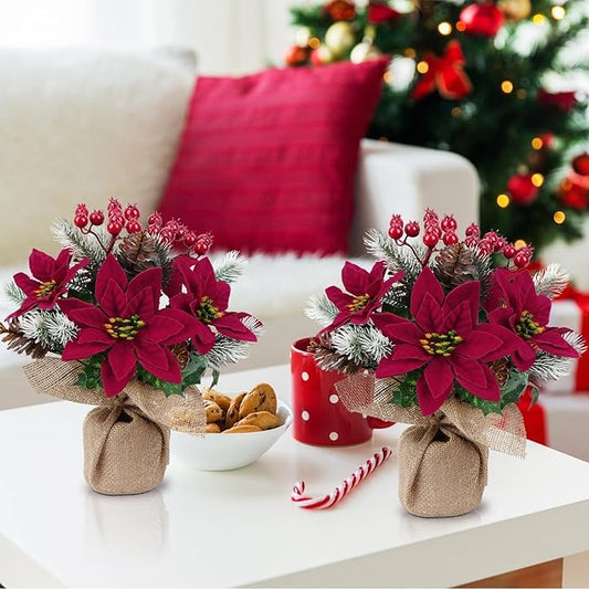 HUAESIN 2PCS Artificial Poinsettias Potted 11" Christmas Plants Fake Mini Christmas Tree with Berries Pinecone Table Centerpieces Indoor Xmas Decorations for Tables Kitchen Office Desk Home