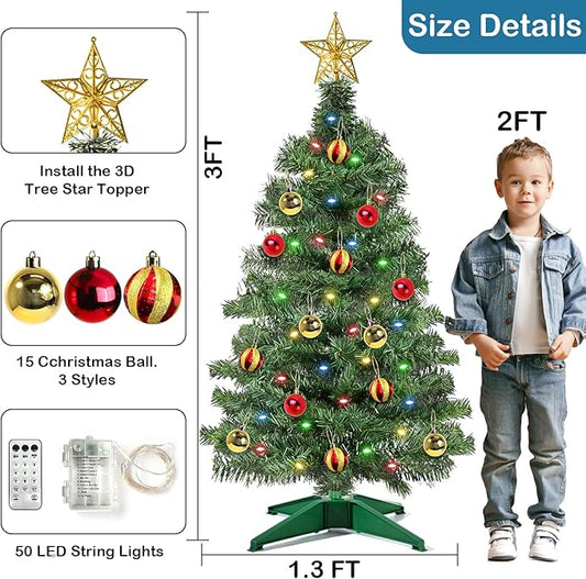 [ Timer & 12 Modes ] 3 Ft Green PVC Christmas Tree with 50 Multi Color Lights DIY 15 Ball Ornaments 3D Star Small Artificial Xmas Tree for Indoor Holiday Party Decorations