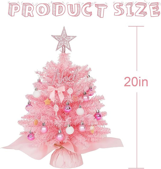 Wangchao Craft 20" Mini Pink Christmas Tree Table Top Artificial Xmas Tree Small Christmas Tree with Lights, Star Treetop and Balls, Tabletop for Girls Rooms