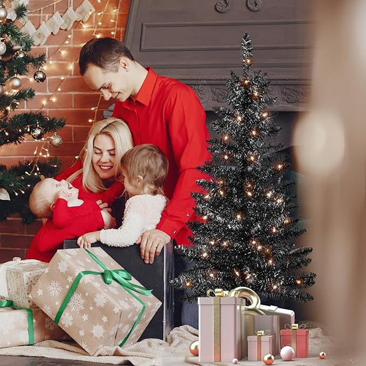 4ft Artificial Full Black Christmas Tree with Separate Lights, Not Pre-lit Mini Black Tinsel Pine Christmas Tree, 50 Lights, Small Xmas Tree for Home, Office, Party Decoration, Indoor