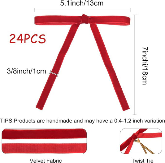 24 Pcs Velvet Christmas Tree Bows Decor, Vintage Wreath Bow for Christmas Garland, Gift Wrapping, Xmas Tree, 3/8'' Wide, 5 * 7 inch (Red)