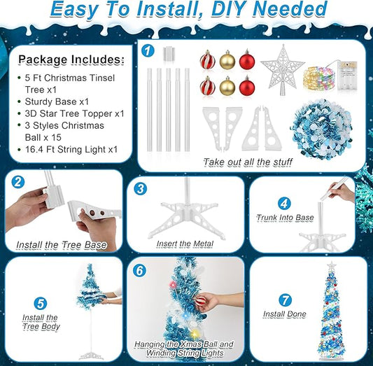 5FT Pop Up Christmas Tree with Timer 60 Warm White & Multi Color Fairy Light 3D Star 15 Ball Ornament, Blue White Tinsel Christmas Tree Slim Pencil Xmas Tree Home Office Holiday Decor Indoor Outdoor