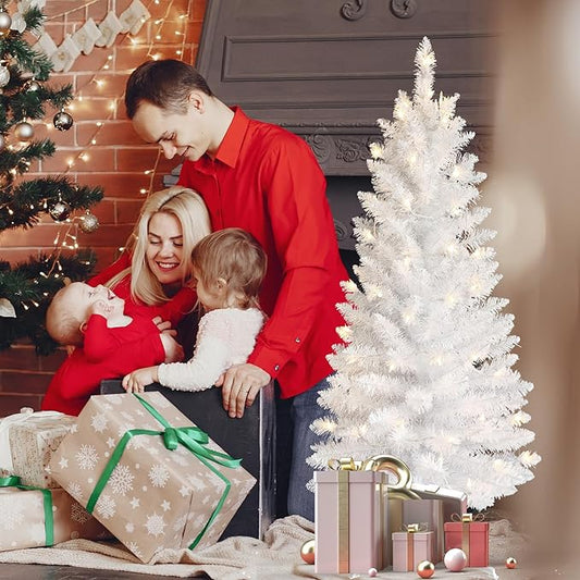 4ft Artificial Full White Christmas Tree with Separate Lights, Not Pre-lit Mini White Tinsel Pine Christmas Tree, 50 Lights, Small Xmas Tree for Home, Office, Party Decoration, Indoor