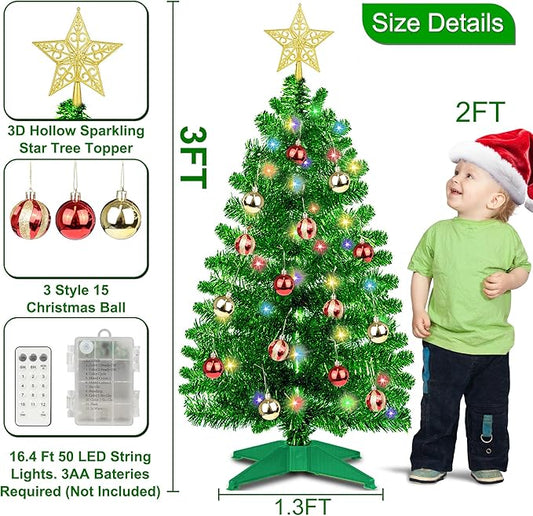 3 Ft Premium Green Christmas Tree 12 Modes Dual Color Change Timer DIY 50 Warm White & Multicolor Lights Star 15 Ball Ornaments Battery Operated Small Artificial Full Xmas Tree Table Home Indoor