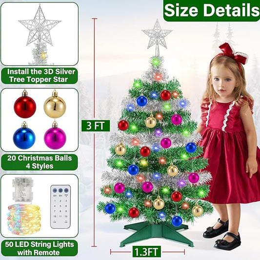 [ 12 Modes & Timer ] 3 Ft Green & Silver Small Christmas Tree with 50 LED Lights, 20 DIY Ornaments, Battery Operated Prelit Christmas Tree Indoor Home Fireplace Holiday Xmas Christmas Decorations