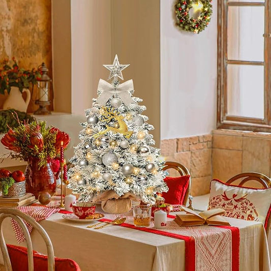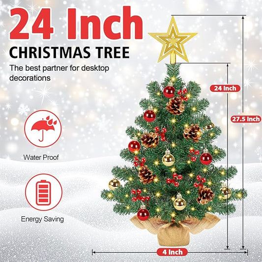 [ Timer & 8 Modes] 24 Inch Artificial Mini Christmas Tree with 50 Warm White Lights Star Treetop and Ornaments Small Tabletop Christmas Tree for Indoor Home Table Christmas Decorations