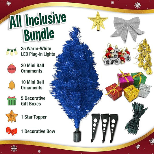Small Blue Christmas Tree with Lights - 23 Inch Mini Tabletop Christmas Tree with Warm-White LED Lights, Hanging Ornaments, Decorative Bow and Gift Boxes - Table Tree for DIY Christmas Decoration