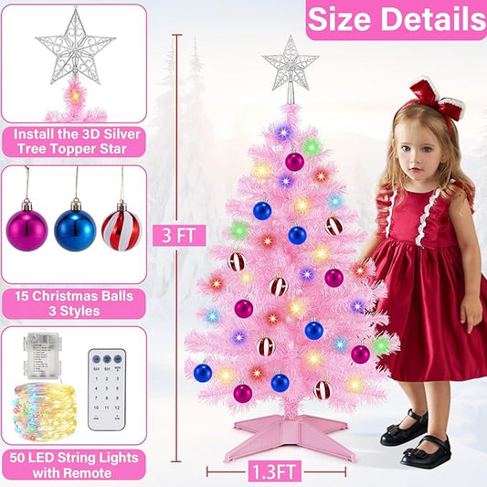 3 Ft Pink Christmas Tree Tinsel Dual Color Change 12 Modes Timer DIY 50 Warm White & Colored Lights 15 Ball Ornaments Star Battery Operated Small Artificial Full Xmas Tree Table Indoor Holiday Decor
