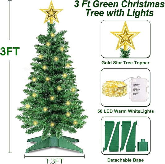 3 Ft Green Christmas Tree with Lights, Timer 8 Modes 50 Warm White Lights Battery Operated Small Artifical Full Christmas Tree for Tabletop Home Office Indoor Outdoor Xmas Holiday Party Decorations