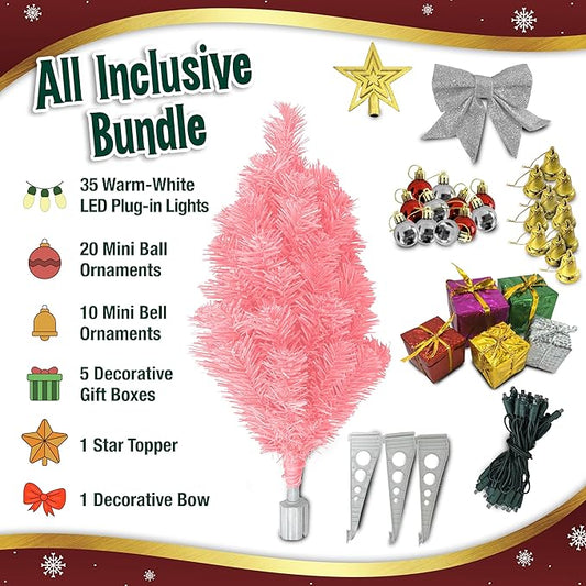 Small Pink Christmas Tree with Lights - 23 Inch Mini Tabletop Christmas Tree with Warm-White LED Lights, Hanging Ornaments, Decorative Bow and Gift Boxes - Table Tree for DIY Christmas Decoration