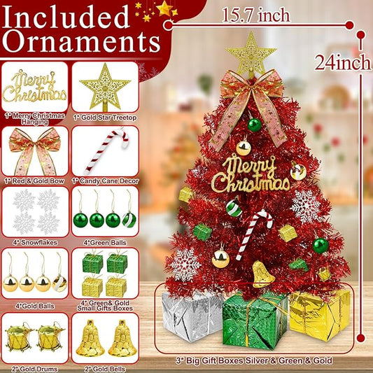 Dual Color Change&Remote Control 24 Inch/2FT Red Tabletop Christmas Tree with Lights Timer, 20 LED Warm White&Colored Lights 8 Modes 27 Orantments Star Boxes Mini Small Xmas Tree Home Holiday Decor