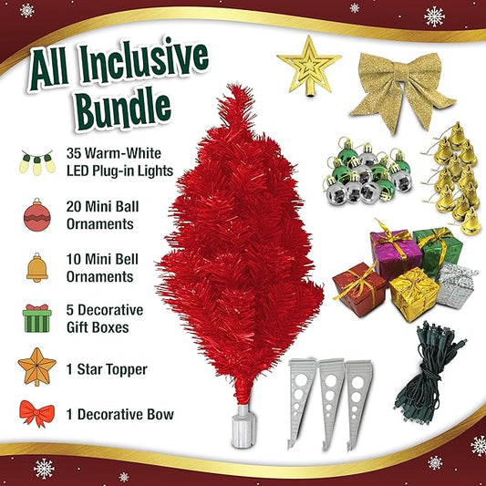 Small Red Christmas Tree with Lights - 23 Inch Mini Tabletop Christmas Tree with Warm-White LED Lights, Hanging Ornaments, Decorative Bow and Gift Boxes - Table Tree for DIY Christmas Decoration