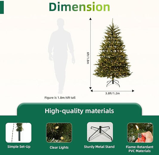 6FT Pre-Lit Artificial Christmas Tree with 500 White Lights, 1430 PVC Branch Tips,Green Dunhill Fir Xmas Tree, Foldable Metal Base for Home, Party Holiday Décor