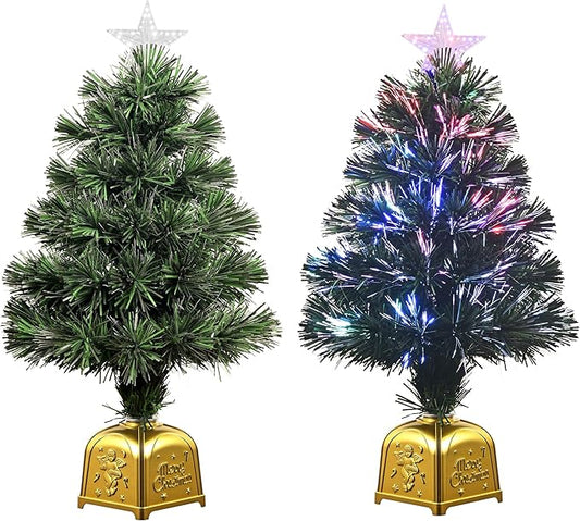24inch Green Pre-lit Fiber Optic Christmas Tree,Tabletop Artificial mini Xmas Tree with Gold Base Pot, Stars for Holiday Home Decorations